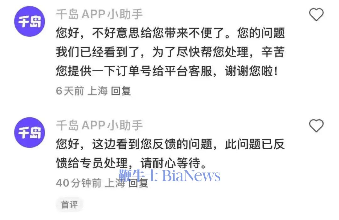 比起Jason来说,佳佳的售后时长已经算短。Jason告诉蓝鲸新闻记者,自己在APP联系客服进行售后时,排队一小时是常见现象,“每一次都大排特排,完全没有办法和客服沟通彻底”。为了能够联系到售后,不少网友表示自己先后辗转多个平台,除千岛APP外,千岛微信公众号留言、社交平台发帖也都是消费者的必经之路。这其中获得反馈最快的是社交平台发帖,“吐槽贴”发出后,评论区大概率会出现千岛官方账号的留言。
