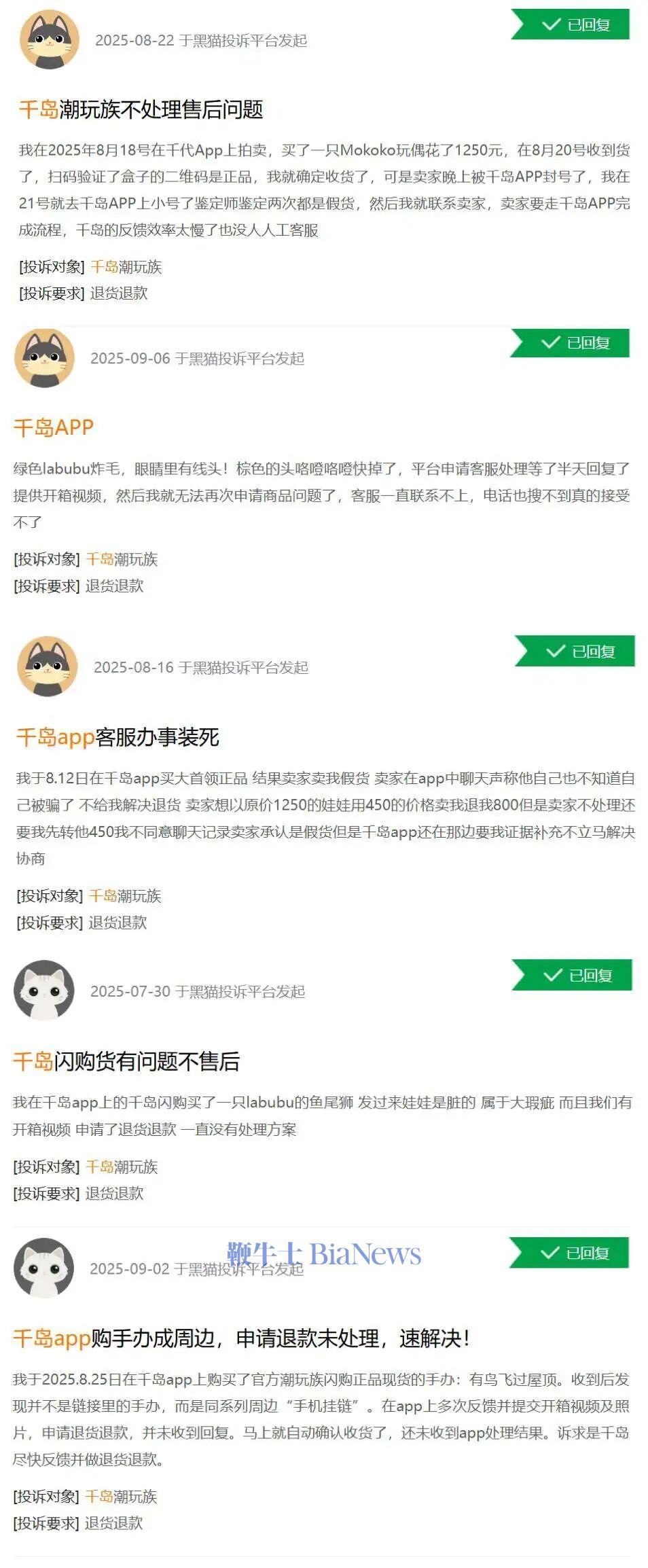 泡泡玛特等潮玩的火爆带火了专注潮玩二手交易的APP千岛,但近日,蓝鲸新闻记者发现不少消费者在社交平台反映在千岛APP遭遇“售后”难题。