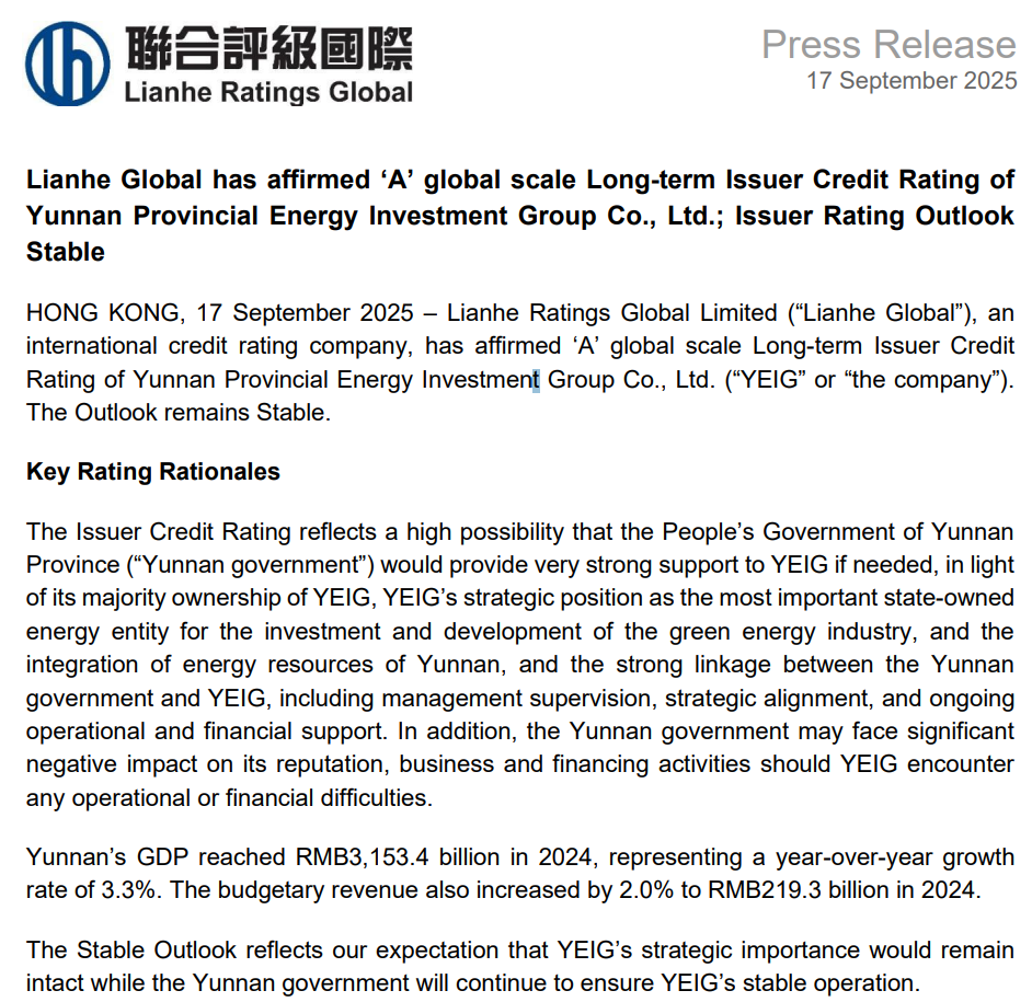 9月17日,联合国际评级机构确认云南省能源投资集团有限公司的国际长期发行人信用评级为“A”,展望“稳定”。